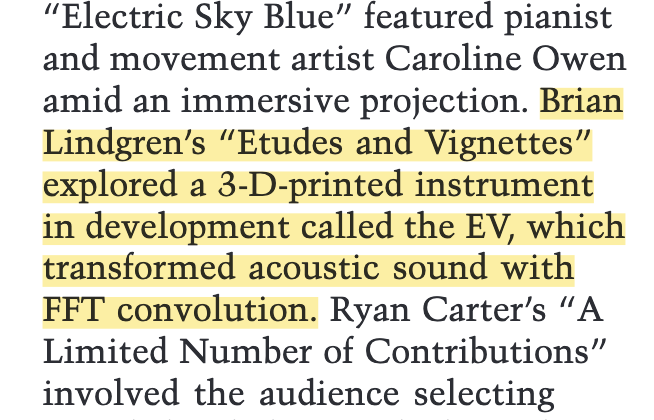 A central focus of his work is the EV, a digital-acoustic instrument he designed to unify the nuance of bowed performance with advanced synthesis. The EV was a semi-finalist in the 2022 Guthman Musical Instrument Competition and has been presented at the International Computer Music Conference (ICMC), the international conference on New Interfaces for Musical Expression (NIME), the International Conference for Auditory Display (ICAD) at the Experimental Media and Performing Arts Center at RPI, the Society for Electro-Acoustic Music in the United States (SEAMUS), PdMaxCon25~, and the NYC Electro-Acoustic Music Festival. Integrating FFT convolution, spatialization, physical modeling, feature extraction, and machine learning, the EV provides a platform for examining how hybrid instruments reshape performer agency and blur boundaries between physical and virtual sound. This research is also reflected in Lindgren’s recent Organised Sound paper on spatial digital instrument design, which situates the EV within broader conversations about embodiment and virtuality in contemporary computer music.